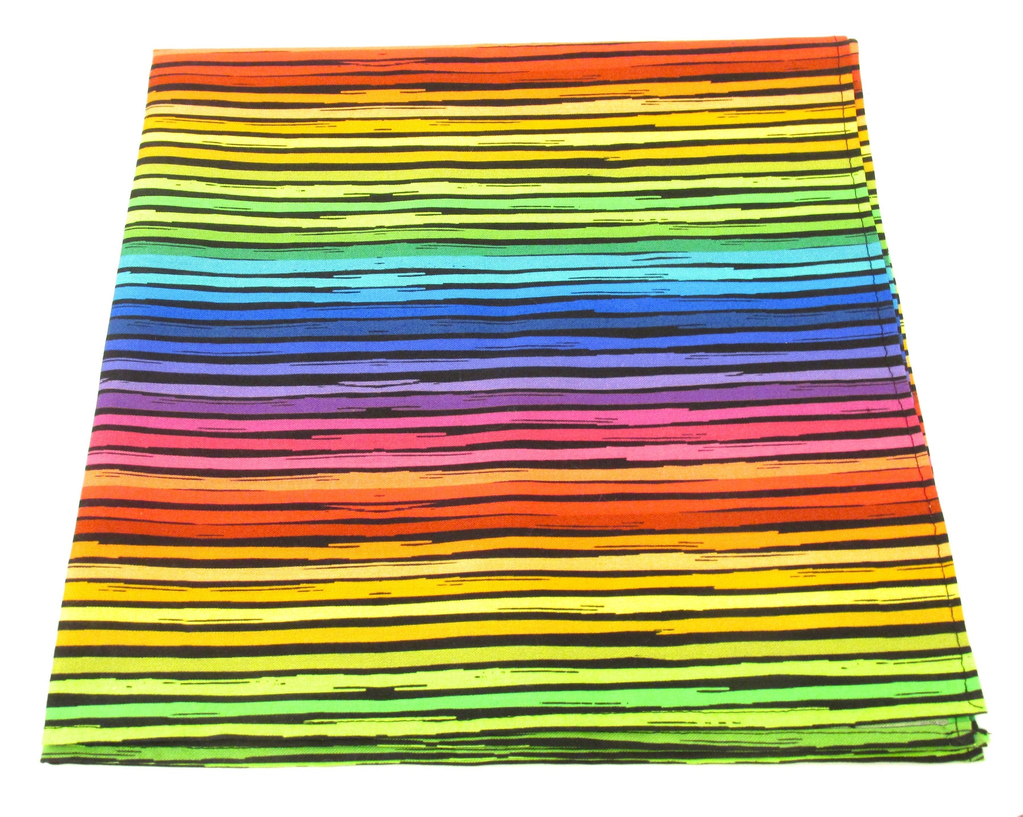 A distinctive, striking rainbow stripe pattern bandana / kerchief. An extremely versatile accessory that can be utilised as a bandana, neckerchief and handkerchief in addition to countless other uses, giving you that practical but stylish edge.