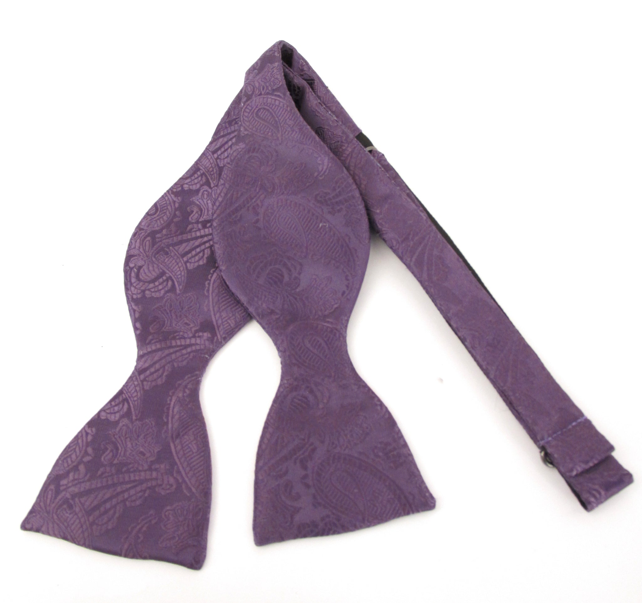 An Aubergine Purple Paisley Self-Tied Bow Tie by Van Buck. This tie yourself bow with a subtle self paisley pattern will bring some class, style and sophistication to any occasion. It has an easily adjustable neckband. The quality of fabric we use for our bow ties is outstanding making them stand out as a quality piece of gentleman's neckwear. Matching pocket squares available.