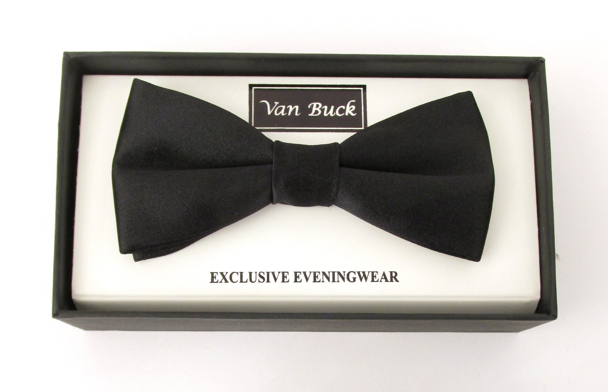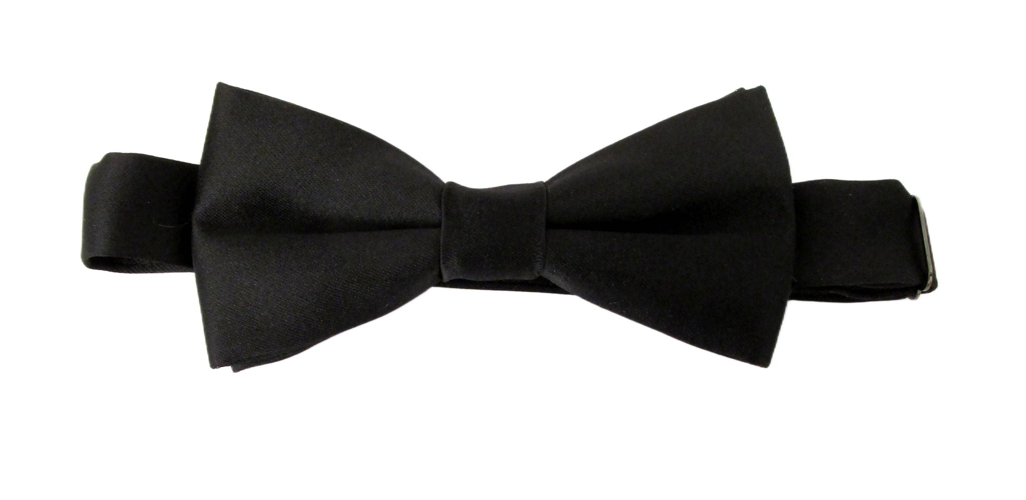 A boys black satin bow tie by Van Buck. This black satin children's bow will have the youngsters looking dapper at any weddings or events. It is made smaller than our standard bow and is pre-tied with an easily adjustable neckband. Our plain satin bow tie collection includes a large range of colours which are perfect for the groom, groomsmen, ushers and page boys for your wedding day. The quality of fabric we use for our ties is outstanding making them stand out as a quality piece of gentleman's neckwear.