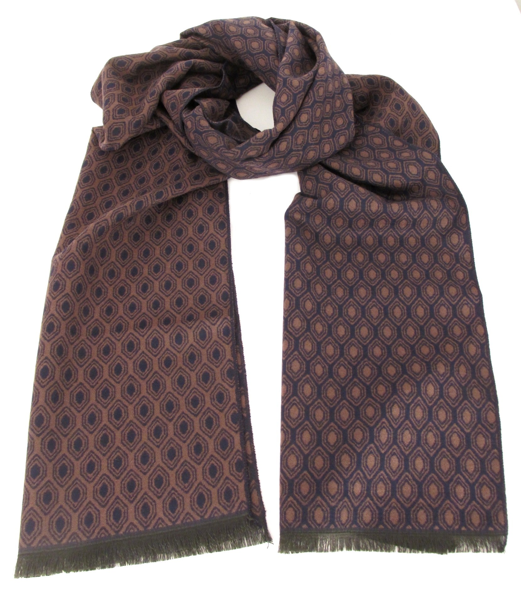 A very soft and luxurious cashmere feel reversible scarf in a neat navy & brown hexagonal geometric pattern. The reversible nature of this scarf is like having two scarfs in one. A great accessory to have this winter to add some style, warmth and comfort to your attire. also a great gift idea!
