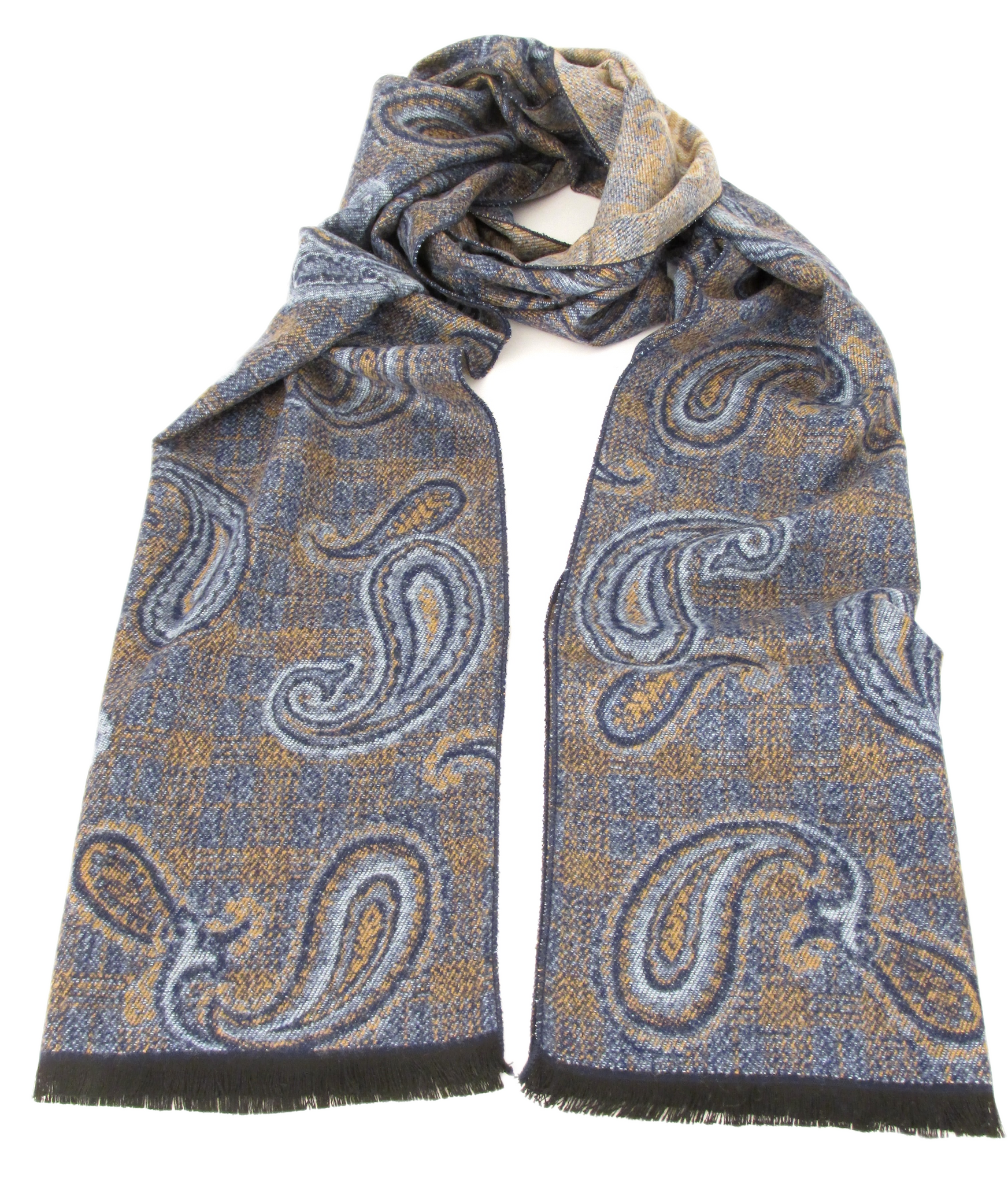 A very soft and luxurious cashmere feel reversible scarf, featuring a dark burgundy brown and sky blue paisley over a checkered ground. This ground really gives the scarf more interest and texture. A great accessory to have this winter to add some style, warmth and comfort to your attire. Also a great gift idea!