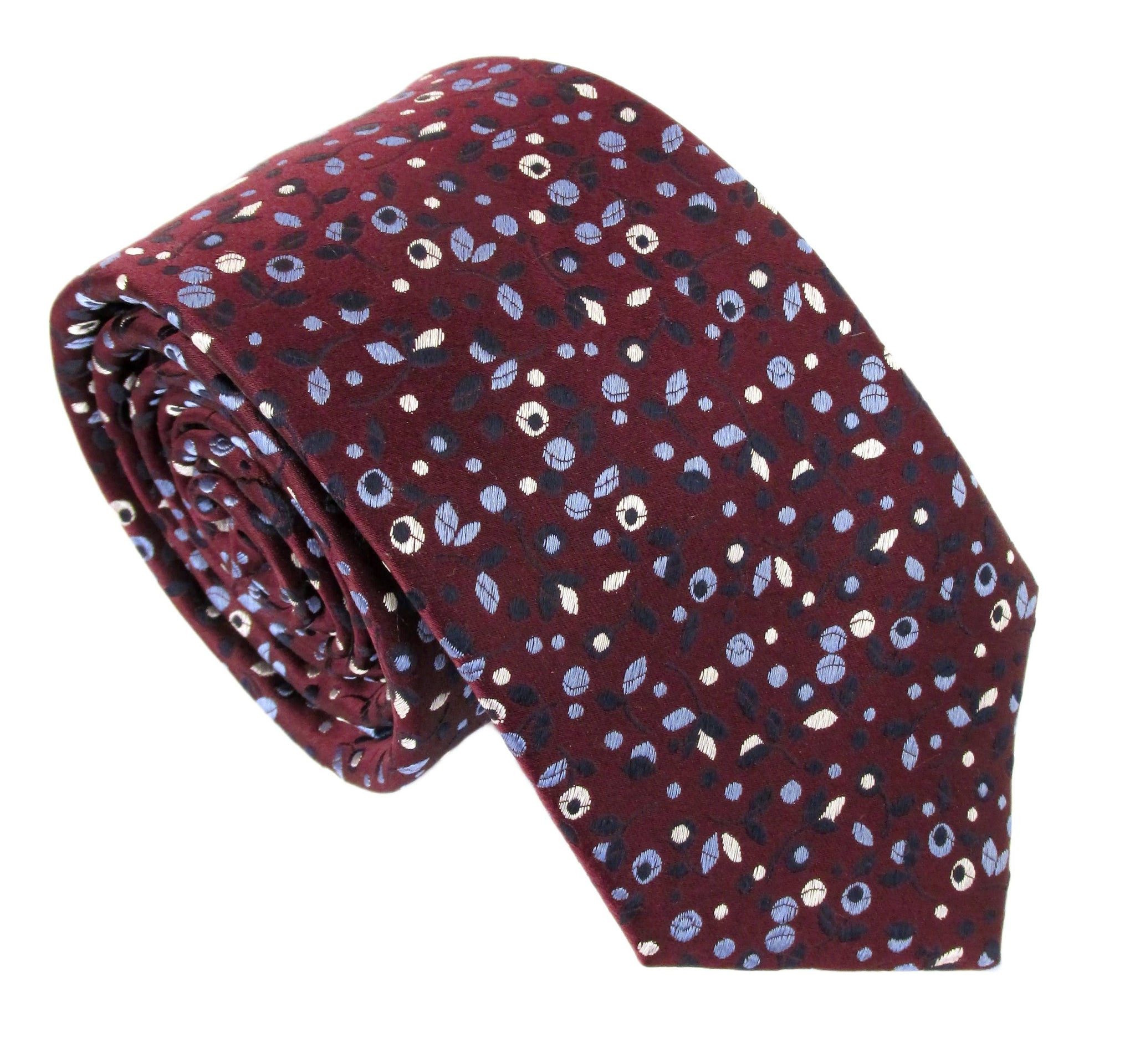 A burgundy wine silk tie with navy blue, white and sky blue small berry and leaf design woven all over creating a stunning neat pattern from our Van Buck London Silk range. This tie is the perfect gift for anyone who likes to look smart at work or out and about. It is sure to add colour and brightness to any outfit and will make you stand out round any table.