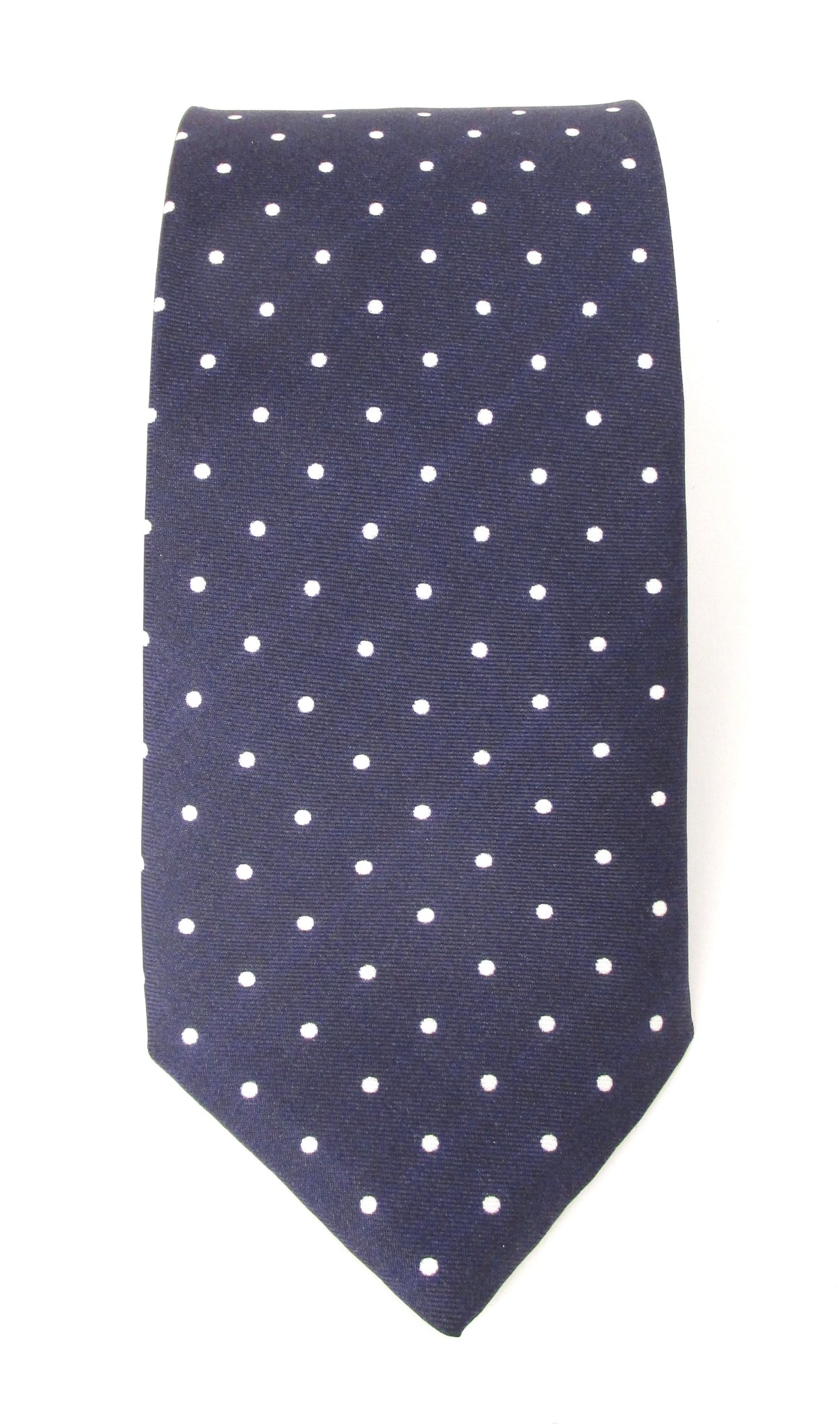 A wonderful polka dot English silk printed tie with a navy blue background and white polka dots all over. This tie is hand finished with quality wool lining. This range of luxury 100% pure silk printed polka dot ties is perfect for weddings, a party or even a day at the office.