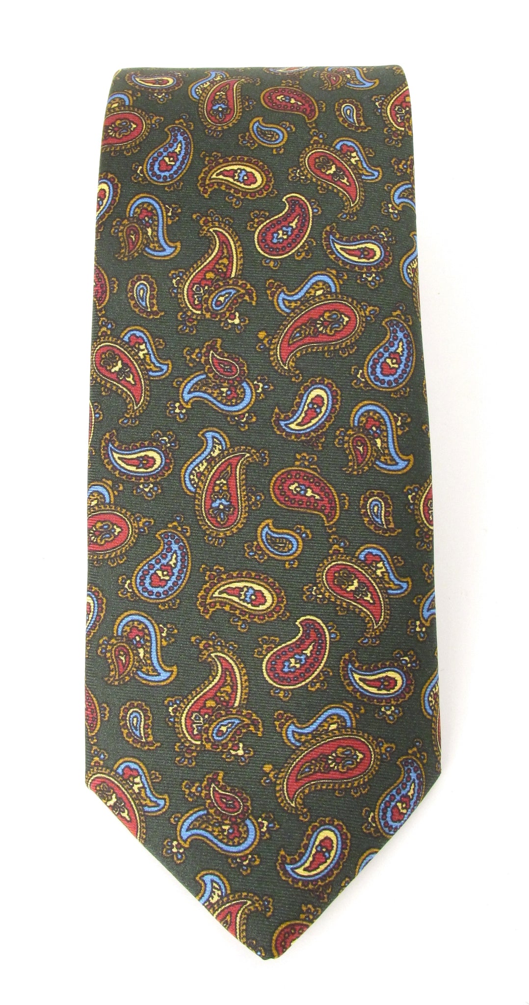 A wonderful paisley English silk printed tie with a dark green background with gold, blue and red paisley patterns all over. This tie is hand finished with quality wool lining. This range of luxury 100% pure silk printed ties are perfect for weddings, a party or even a day at the office.