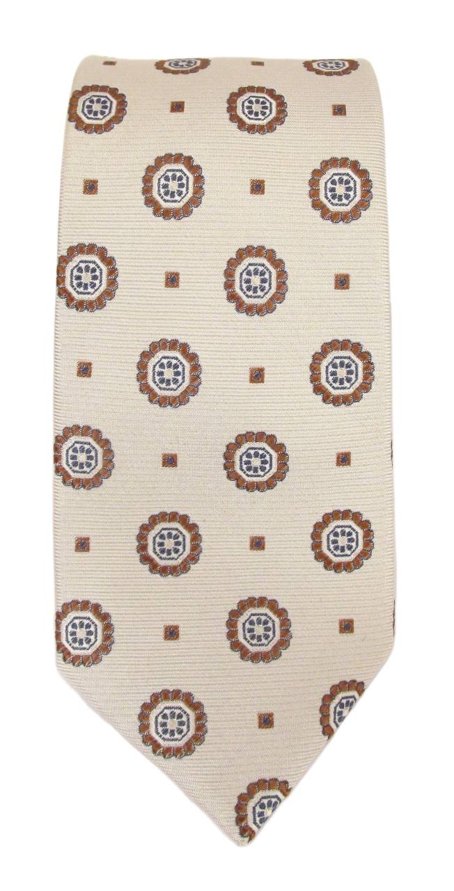 A dashing beige large medallion motif silk tie with dotted accents. This striking silk tie is part of the Van Buck Red Label Silk Collection. Our red label ties are woven from heavier silk yarn to give a nice quality feel, vibrant colours as well as the perfect knot. This silk tie is perfect for weddings, a party or even a day at the office. The quality of fabric we use for our ties is outstanding making them stand out as a quality piece of gentleman's neckwear.