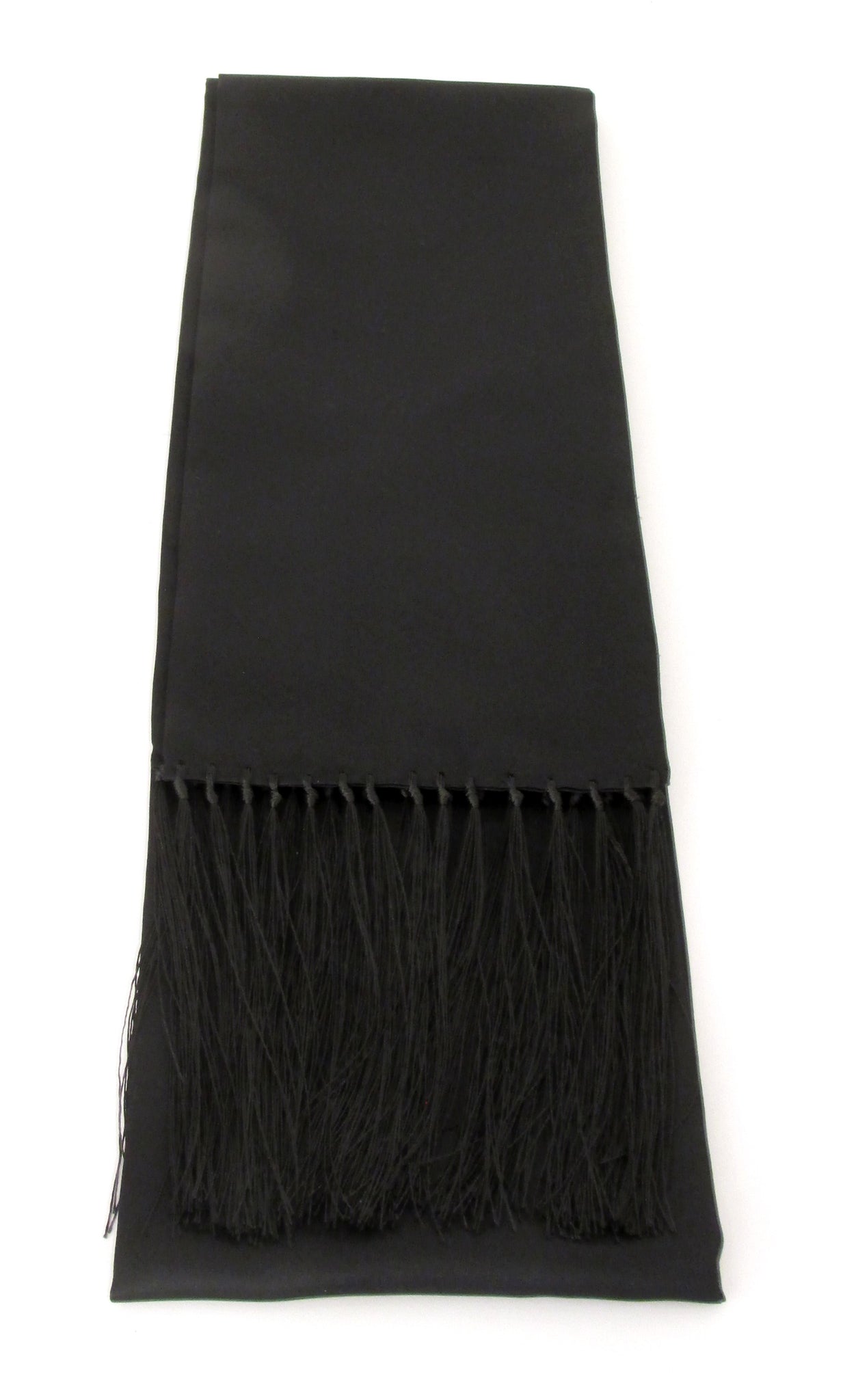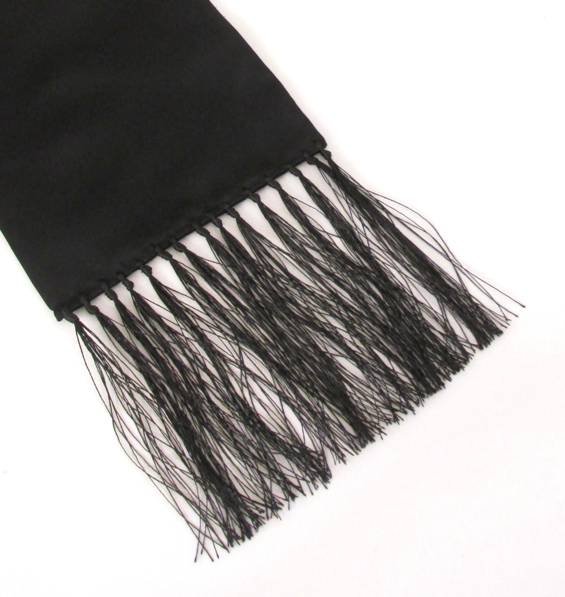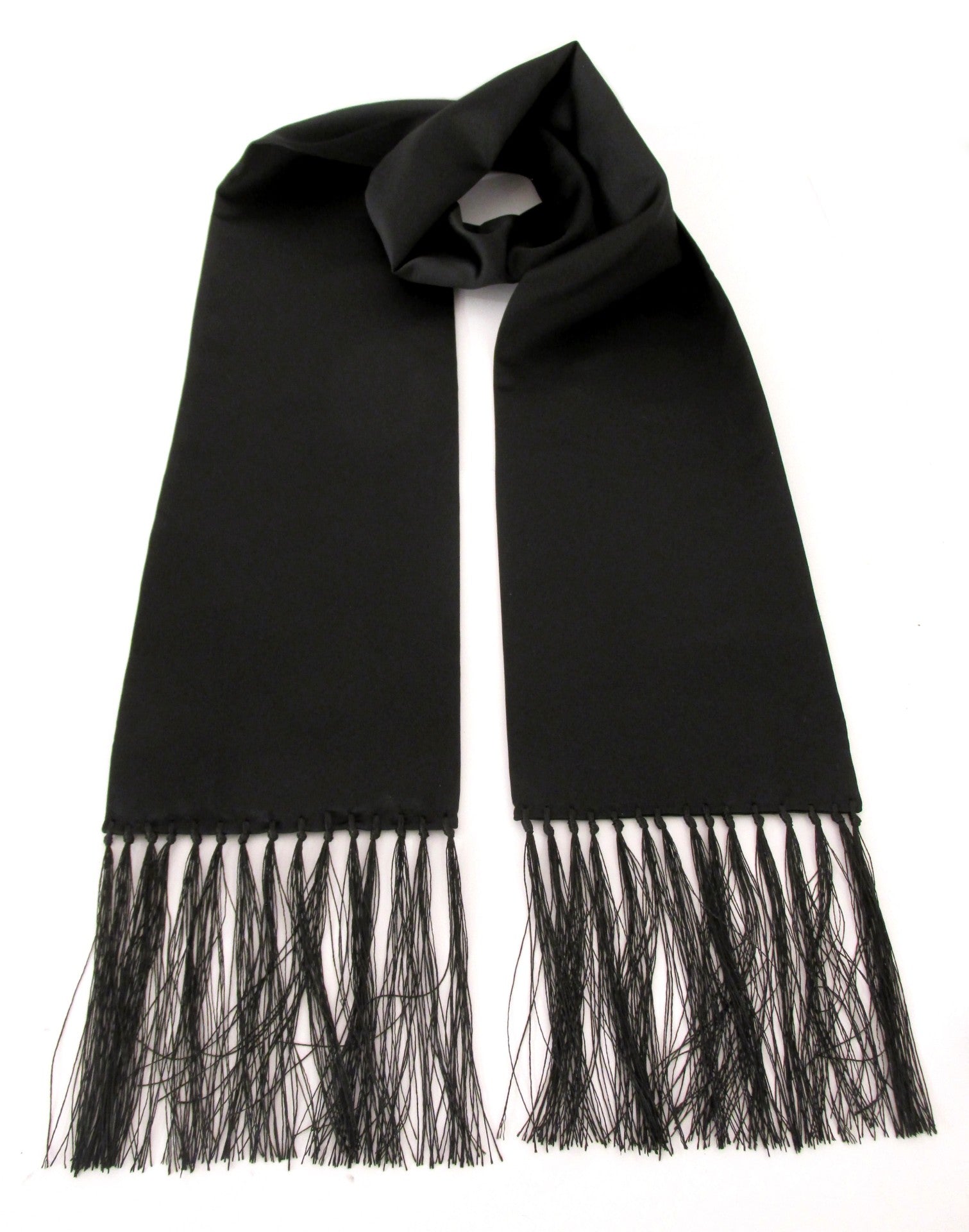 A black dress scarf with tassels. This is a classic, timeless piece with an air of elegance, style, sophistication as well as a subtle flair in this classic black colourway.